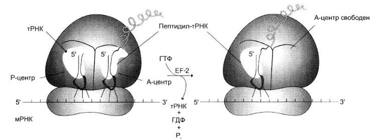 3. Транслокация – к рибосоме присоединяется фактор элонгации ЕF-2 и за счёт энергии ГТФ продвигает рибосому по мРНК на один кодон к 3'-концу и дипептидил-тРНК из А-центра перемещается в Р-центр. Свободная от метионина тРНКiМeт покидает рибосому, а в область А-центра попадает следующий кодон