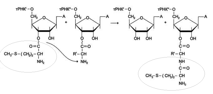 Метионин от Мет-тРНКiМет, находящегося в Р-центре, присоединяется к α-NН2-группе аминоацильного остатка аа1-тРНКaa1 А-центра с образованием новой пептидной связи.