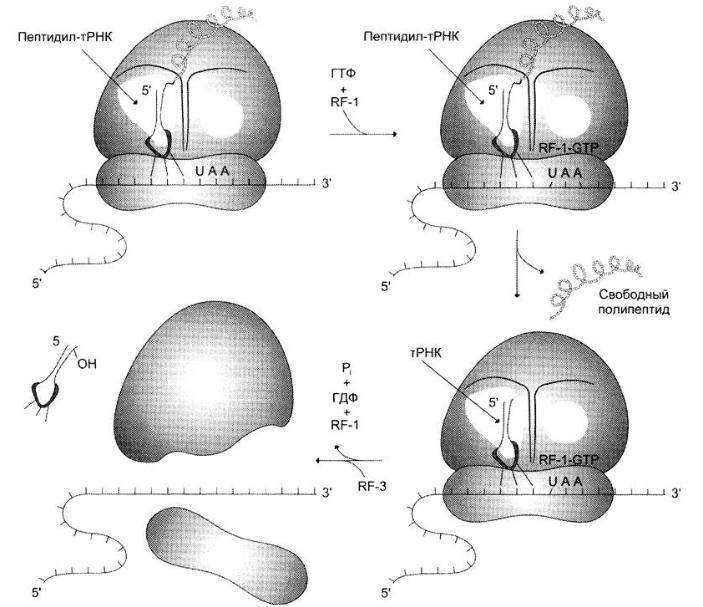 Терминация трансляции наступает в том случае, когда в А-центр рибосомы попадает один из стоп-кодонов: UАG, UАА или UGА. Для стоп- кодонов нет соответствующих тРНК. Вместо этого к рибосоме присоединяются 2 белковых высвобождающих фактора RF или фактора терминации. Один из них с помощью пептидилтрансферазного центра катализирует гидролитическое отщепление синтезированного пептида от тРНК. Другой за счёт энергии гидролиза ГТФ вызывает диссоциацию рибосомы на субъединицы.