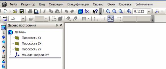 Если щелкнуть в появившемся окне по пункту Деталь, то появится главное окно системы, настроенное на режим работы с деталями (рис. 1.3). Графическим интерфейсом для управления процессом проектирования и редактирования деталей и узлов является Дерево построения. В нем дается графическое