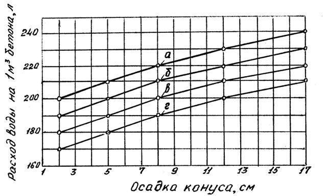 Так, как график составлен для гравия и песка средней крупности, то следует проводить следующую корректировку. При использовании щебня к расходу воды, определенному по этому графику, следует добавить 10 литров.