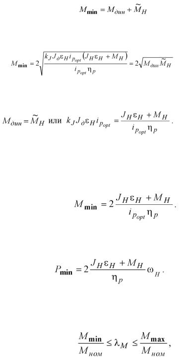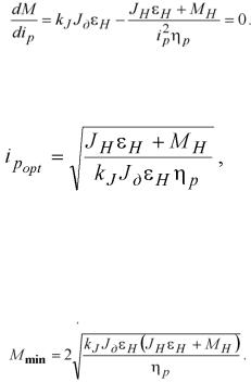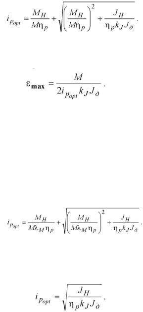 Минимизация времени переходного процесса при заданных параметрах ЭД. Для уменьшения времени переходного процесса в приводах следящих систем, работающих, как правило, в режиме частых пусков и торможении, необходимо уменьшать приведенный динамический момент привода. В этом случае в качестве критерия оптимального передаточного числа iPopt принимают максимальную величину развиваемого приводом ускорения εн в динамических режимах работы, характеризуемых моментом инерции Jн и постоянным моментом Mн.