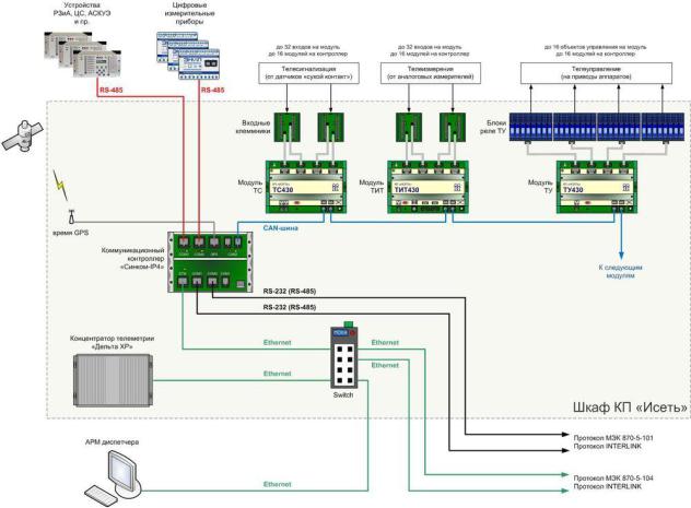 Аппаратура КП может быть при необходимости разнесена на несколько шкафов при помощи расширения CAN-шины или оптических удлинителей.