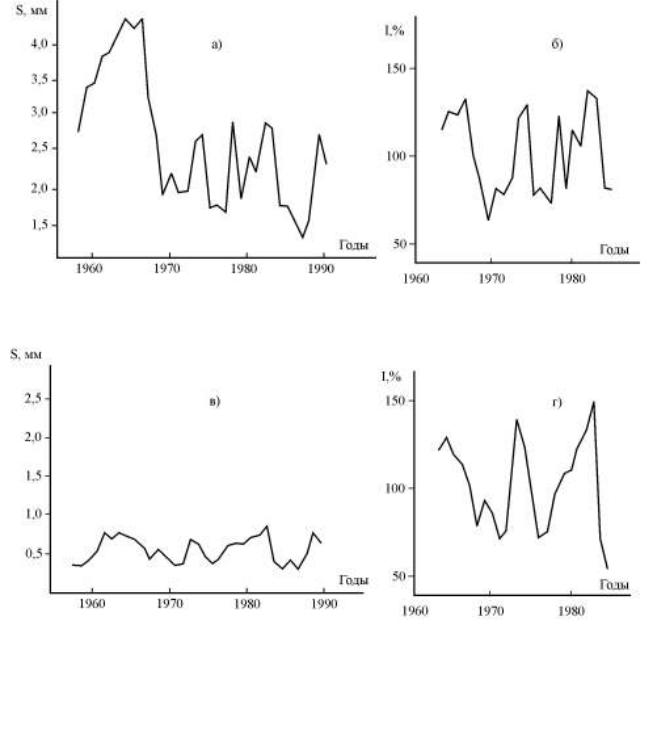 а) Общая ширина годичного кольца, мм; б) Относительные индексы годичного кольца, %; в) Ширина поздней древесины, мм;