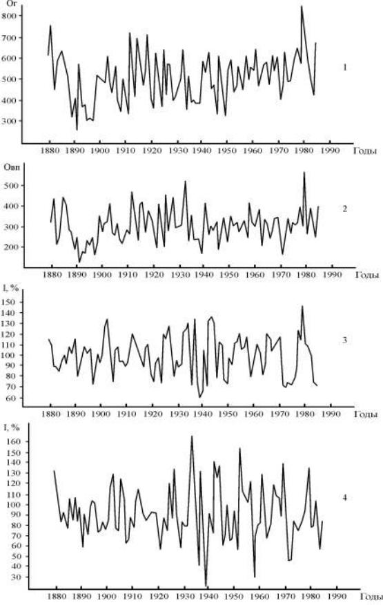 Рис. 2. Динамика суммы осадков за год (1), за теплый период (2), индексов прироста сосны Усманского бора: общей ширины годичного кольца (3), поздней древесины (4)