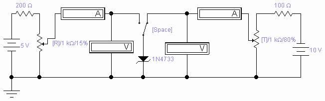 Схема аналогична схеме для исследования параметров полупроводникового диода. Из библиотеки Diodes на рабочее поле поместите стабилитрон: