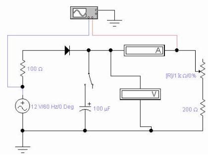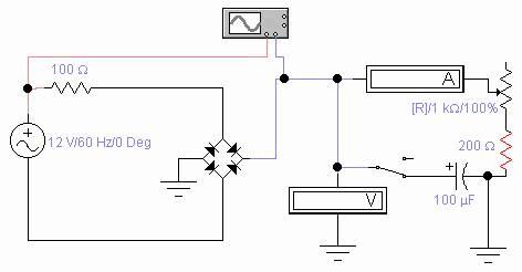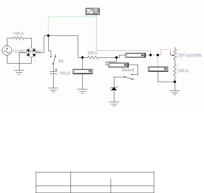 7. Соберите схему двухполупериодного выпрямителя с емкостным фильтром и параметрическим стабилизатором: