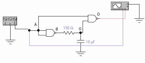 4.1.1. Соберите схему (рисунок 1). Зарисуйте осциллограммы в точках А, В, О, D при подаче на вход импульсов от внешнего генератора (соедините канал В осциллографа с выходом D, а к каналу А - поочередно подключите точки А, В, О исследуемой схемы).