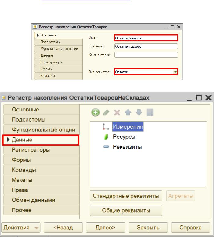 Добавим новый регистр накопления «ОстаткиТоваровНаСкладах». Вид данного регистра – «Остатки».
