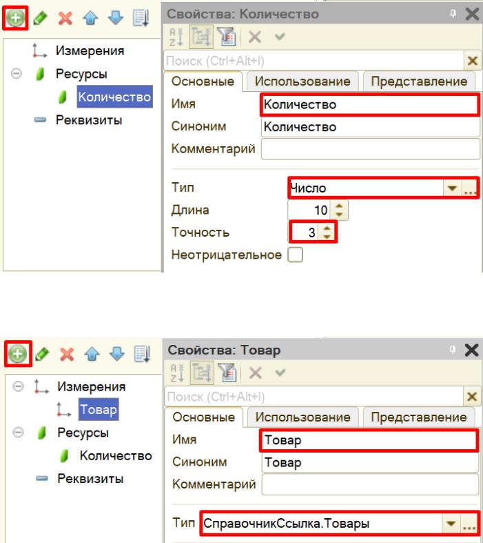 Заполнение данного окна проще всего начинать с добавления ресурса. Чтобы понять, что использовать в качестве ресурса, следует задать вопрос: «Что мы хотим накапливать/считать в данном регистре?». Мы хотим считать количество. Следовательно, количество и будет являться ресурсом. Тип данного реквизита – «Число». Точность – «3», поскольку в реквизит должно попадать количество с точностью до грамм.