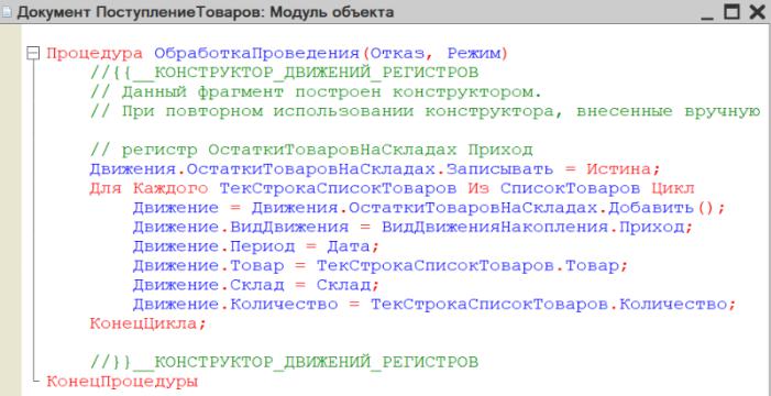 При нажатии на кнопку «ОК» система сформирует программный код, который при успешном проведении документа произведет движения в регистр накопления, то есть скопирует данные из документа в регистр накопления.