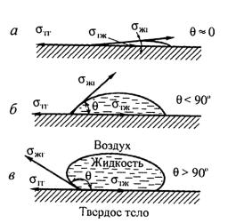 Если угол θ острый (θ < 90o) и cosθ > 0, то есть σ20 > σ12, то жидкость смачивает твердое тело (рис. 6а).