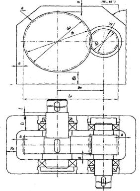 При этом достаточно изображение двух схематичных проекций редуктора (Рис. 6.1) вида спереди и вида сверху (со снятой крышкой).