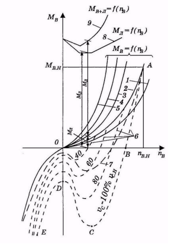 Вид реверсивных характеристик гребного винта для разных значений первоначальной скорости судна νс приведен на рисунке 3 (кривые 6). Точка А соответствует ходу судна в свободной воде с номинальной скоростью nB.H и номинальной частоте вращения гребного винта nB.H. После прекращения подачи энергии к ГЭД частота его вращения быстро снижается до значения (0,6 - 0,75) n B.H, соответствующего шагу нулевого момента (точка В). За счет энергии набегающего потока гребной винт продолжает вращаться в ту же сторону и на участке ВСD сам развивает вращающий момент (отрицательный момент сопротивления), работая в режиме гидротурбины; максимальное значение момента (до 0,9 МBH) достигается при частоте вращения около 0,35 n B.H (точка С).