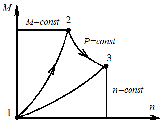 Выход на номинальную частоту вращения (в диапазоне от рабочей точки 2 до рабочей точки 3, рис. 4) поддерживается режим постоянства мощности ГЭД PГЭД = const, продолжительность около 5 минут.