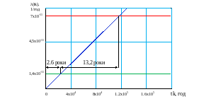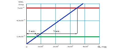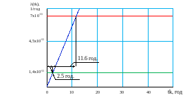Графік залежності для структури 2-х дубльованих комплектів 2 з 2 та інтенсивністю відмови одного каналу 10-6 представлений на рисунку 4.12.