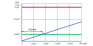 Графік залежності для структури 2 з 2 та інтенсивністю відмови одного каналу 10-8 представлений на рисунку 4.7.