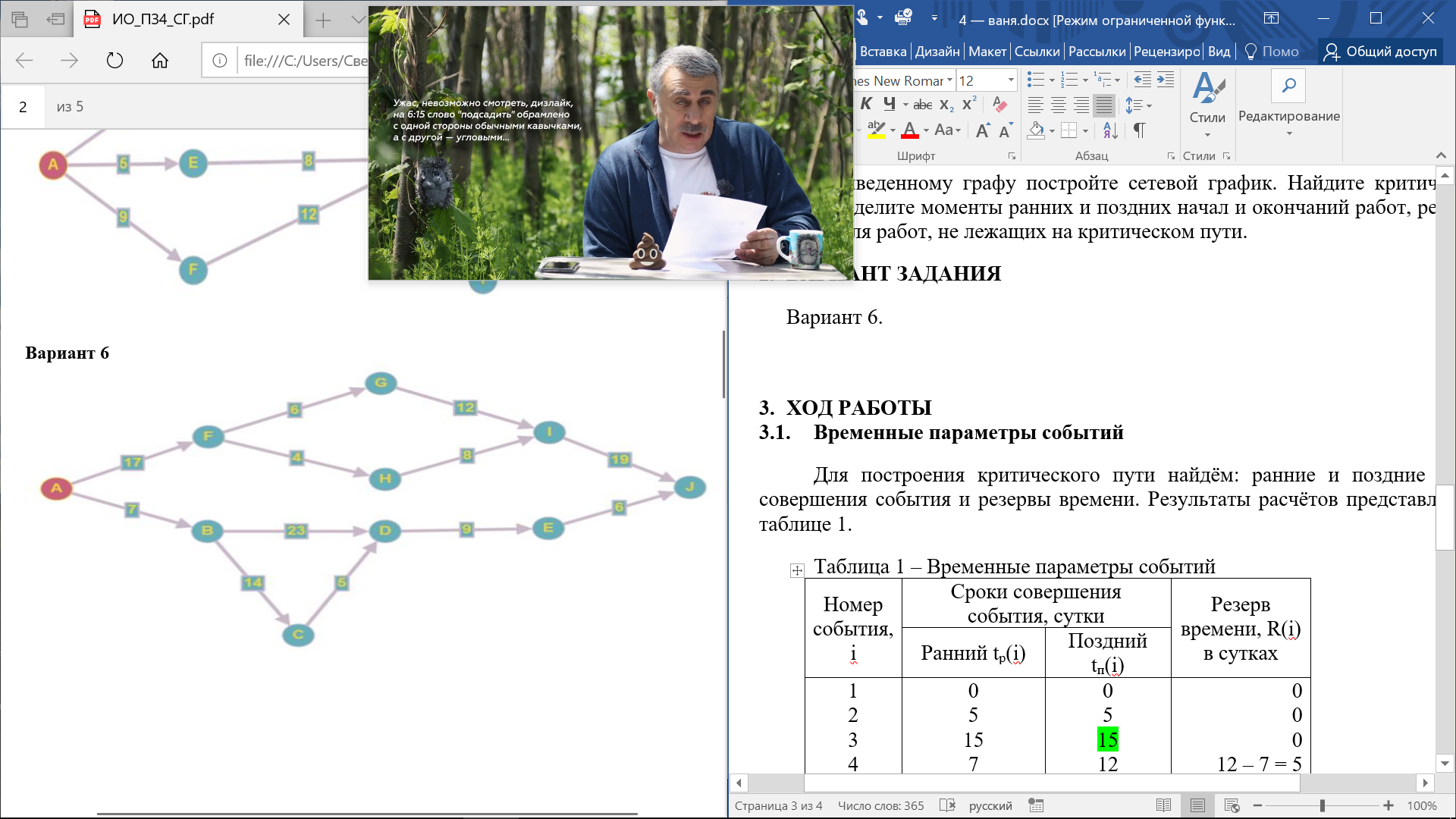 Был построен сетевой график, найден критический путь; определены моменты ранних и поздних начал и окончаний работ и резервы времени для работ, не лежащих на критическом пути.