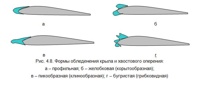 Обледенение на поверхности ВС может принимать различные формы в зависимости от вида льда и скорости полета (рис. 4.8).