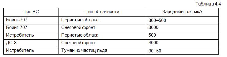 Электрический заряд, приобретаемый ВС при полете в облаках и осадках, зависит как от свойств среды, в которой летит ВС (размеры и число частиц облаков и осадков, их фазовое состояние и форма, электрические заряды на них, значение напряженности электрического поля атмосферы), так и от характеристик ВС (его конструкции, в частности, материала покрытия, типа двигателей, параметров статических стекателей) и режима полета (мощности двигателей, высоты, скорости). Характерные значения зарядных токов, создаваемых осадками, на ряде ВС представлены в табл. 4.4.