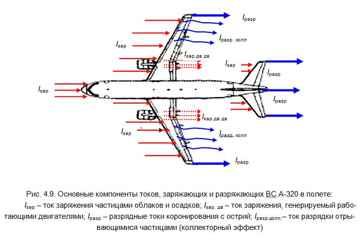Плотность заряда, как уже отмечалось, резко повышается на концах крыльев, стабилизатора, киля. Достаточно велика она и в носовой части фюзеляжа. При полете в облаках и осадках за счет разрыва контактов капель и кристаллов с поверхностью ВС, во время которых создается эффект его заряжения, одновременно происходит и процесс уноса части заряда ВС частицами, отрывающимися от его поверхности (так называемый коллекторный эффект). Величина заряда, уносимого отрывающейся частицей, пропорциональна площади ее поверхности и плотности заряда в точке отрыва частицы. Там, где плотность заряда мала (например, на участках крыльев, близких к фюзеляжу), коллекторный эффект будет пренебрежимо мал, а в зонах, близких к законцовкам крыльев и оперения, может создаться достаточно заметный коллекторный ток разрядки ВС. Разрядка ВС создается проводимостью атмосферы, проводимостью струи горячих газов выхлопа, срывом частиц облаков с электрически заряженного ВС, током коронного разряда, текущим через разрядники, и током коронного разряда, текущим через выступающие заостренные части ВС (стойки антенн, кромки крыльев, антенны и т. д.).