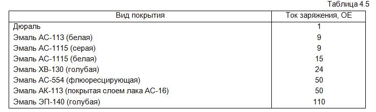 Материал внешнего покрытия, нанесенного на ВС в зоне контакта атмосферных аэрозолей с его поверхностью, существенным образом определяет эффект заряжения ВС. Как показали эксперименты, наименьшие эффекты заряжения наблюдаются на чисто металлических поверхностях. Нанесение диэлектрического покрытия на поверхность тела обычно резко увеличивает его электризацию. В табл. 4.5 приведены экспериментальные данные, полученные в аэрозольной аэродинамической трубе при измерении токов заряжения, текущих на крыло ВС Ан-24, помещенное в поток водяных капель с размерами, близкими к облачным. На крыло наносились различные покрытия из применявшихся в самолетостроении эмалей.