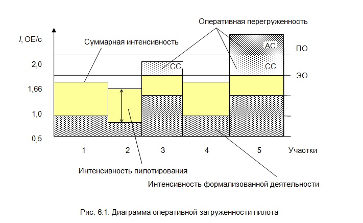 Поэтому расчет загруженности пилотированием осуществляется с помощью специального графика для заданных условий полета и уровня техники пилотирования. При построении диаграммы интенсивность формализованной деятельности суммируется с интенсивностью пилотирования пилота на каждом участке (см. рис. 6.1.).