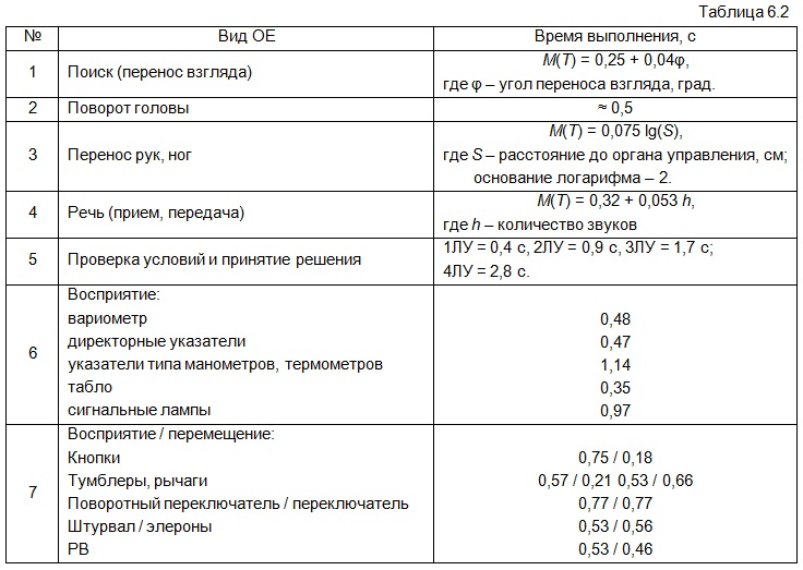 Оперативные единицы состоят из афферентных (a), т. е. сенсорных операций, и эфферентных (e) – моторных операций, которые записываются в порядке их выполнения в колонку «Вид ОЕ». В графе «Примечания» приводятся данные о повороте головы, переносе руки и другие характеристики моторных действий членов экипажа. Время выполнения отдельных ОЕ можно определять экспериментально или брать из табл. 6.2.