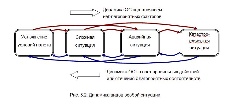Поскольку в полете характеристики ВС, экипажа и факторы влияния внешней среды могут изменяться, то, соответственно, изменяется и вид особой ситуации. Динамика видов и варианты переходов между видами ОС в системе «экипаж – воздушное судно» представлены на рис. 5.2.
