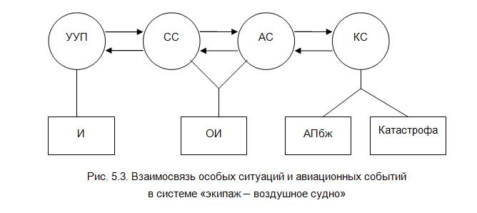 Рассмотренные ранее факторы влияния, отклонения, управляющие воздействия экипажа, особые ситуации и неблагоприятные события взаимосвязаны. Появившийся фактор влияния оказывает воздействие на систему «экипаж – воздушное судно». В результате возникает то или иное отклонение, которое через управляющее воздействие экипажа может быть устранено, локализовано или может получить дальнейшее развитие. При этом возникает соответствующая полетная ситуация, которая может перейти в неблагоприятное событие. Виды особых ситуаций и классы авиационных событий имеют общие признаки по величине отклонений, тяжести травм людей и состоянию ФС ВС.