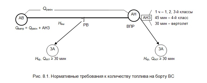 Решение о количестве АНЗ принимает командир ВС в зависимости от аэронавигационной, метеорологической обстановок по маршруту, на аэродромах и расстояния до запасного аэродрома. В любом случае АНЗ не может быть меньше указанного на рис. 8.1.