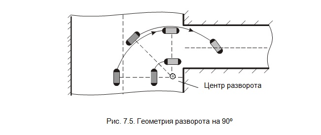 В таких случаях разворот на 90º начинают после проруливания середины РД, на которую нужно срулить. Кроме того, разворот необходимо начинать на удалении от края ВПП, равном не менее радиуса разворота внутренних колес шасси. Радиусы разворота всех колес шасси сходятся в одной точке – центре разворота, который находится на пересечении продолжения прямой, соединяющей ОНШ с перпендикуляром к плоскости переднего колеса шасси (рис. 7.5).