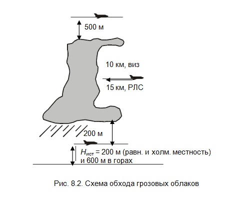 Запрещается преднамеренный вход в мощно-кучевые и кучево-дождевые облака и зоны сильных ливневых осадков. При обходе грозовых облаков экипаж обязан выдерживать боковые и вертикальные интервалы не менее указанных на рис. 8.2.