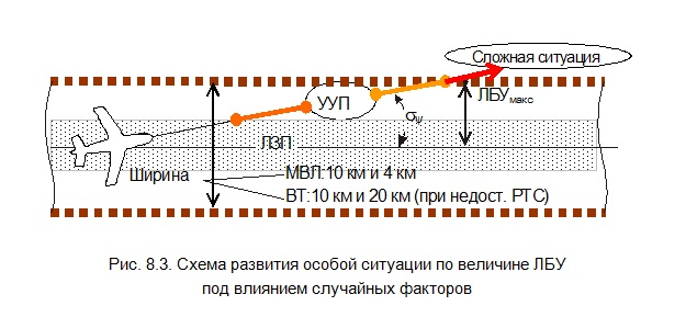 В качестве пояснения к рис. 8.3 рассмотрим влияние суммарной ошибки по выдерживанию курса. Расчет суммарной ошибки производится на наихудший случай, т. е. все ошибки (погрешности) считаются одинакового знака. Примем, σy = –5°, ширина ВТ составляет 10 км, скорость полета равна 800 км/ч. Экипаж, считая, что фактический курс совпадает с выдерживаемым, не вносит поправок в курс. При этих условиях время, через которое произойдет пересечение границы ВТ (т. е. переход в сложную ситуацию), составит около 4,3 мин.