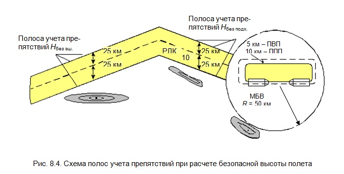 Безопасные высоты полета ВС ГА рассчитываются с учетом господствующих превышений рельефа в установленной полосе учета препятствий (рис. 8.4).