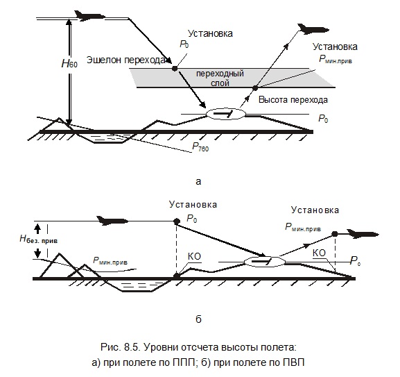 Безопасные высоты, рассчитанные для соответствующих этапов полета, измеряются и выдерживаются относительно изобарических поверхностей с заданным атмосферным давлением. Высота заданной изобарической поверхности в пролетаемом районе является уровнем отсчета высоты полета. В зависимости от условий полета (по ППП или ПВП) и этапа полета установлены различные уровни отсчета высоты.