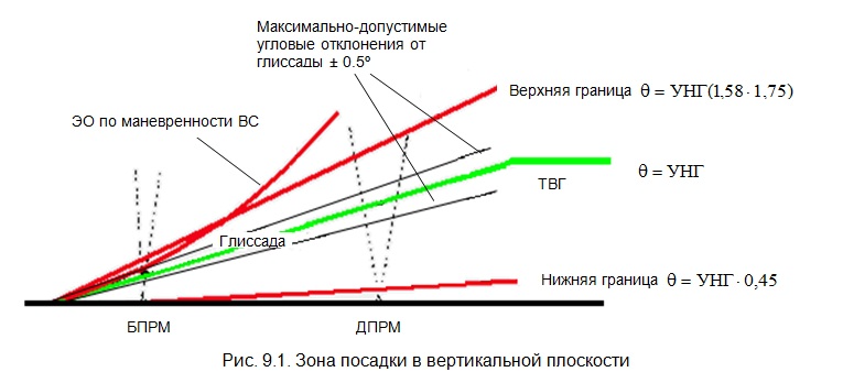 В вертикальной плоскости зона посадки относительно глиссады состоит из верхнего и нижнего полусекторов (рис. 9.1).