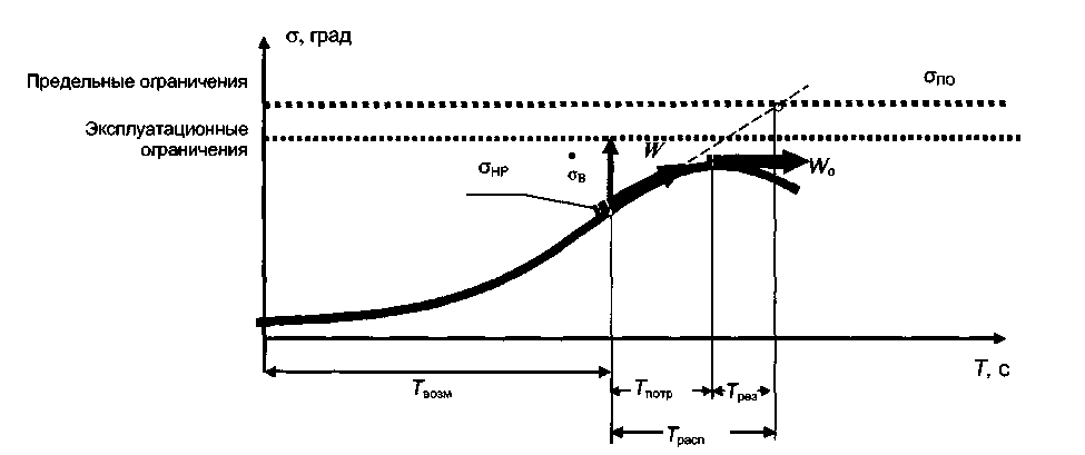Рис. 3.4. Временные характеристики деятельности экипажа: Т расп - располагаемое время;Тпотр - потребное время; Трез - резервное время; Твозм - время возмущения регулируемого параметра полета; анр - величина отклонения в момент начала регулирования; Wa - вектор изменения отклонения в координатном поле σ/Т; а„ ~ скорость изменения (возмущения) регулируемого параметра