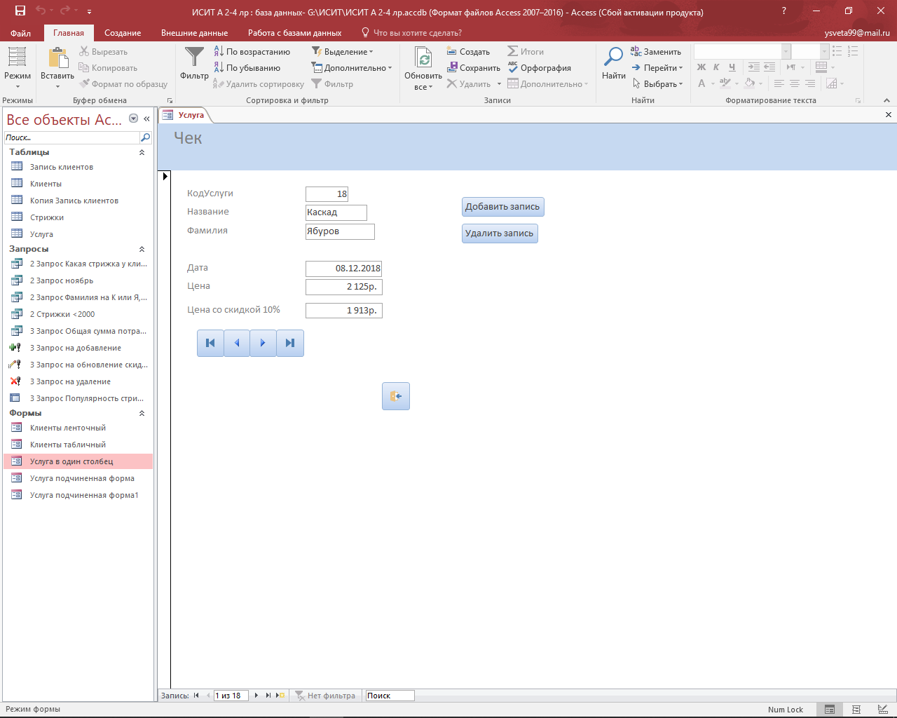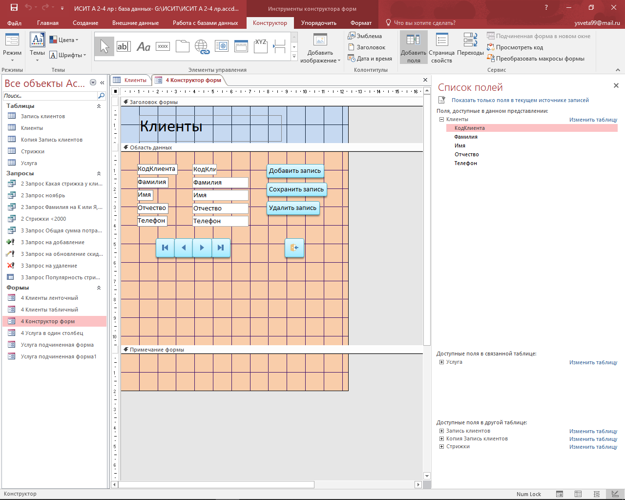 Научитлась создавать формы в MS Access. Создано 3 формы с использование автоформы и 1 форма с использованием конструктора форм. Изучены инструментарий создания форм в конструкторе. Улучшены знания программного продукта MS Access.