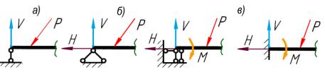 Консольная заделка (защемление) накладывает три связи, препятствующие вертикальному и горизонтальному перемещениям и повороту опоры (рис. 1.1, в).