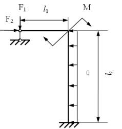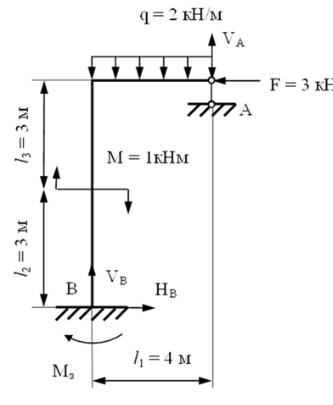 Дано: М = 1 кН∙м; F = 3 кH; q = 2 кН/м; ℓ1 = 4 м; ℓ2 = 3,0 м; ℓ3 = 3,0 м;