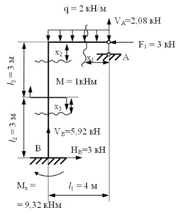 8. Для заданной системы, с учетом найденной реакции VA (рис. 2.13), определяем момент и реакции в опоре В, используя уравнения статики. Делаем проверку правильности их определения.