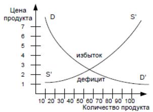 Рисунок 3 – Равновесная цена и количество продукта Дефицит продукта, который возникает при цене ниже равновесной,