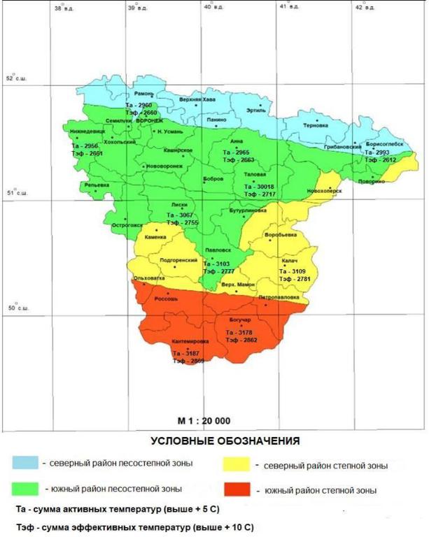 Рисунок – Карта-схема районирования территории Воронежской области по суммам эффективных температур