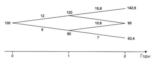 первоначальные инвестиции в него равны 90 д.е. Существует некоторая неопределенность относительно состояния проекта в будущем. Если в первый год будет высокий спрос на продукцию, производимую согласно проекту, то в конце года прибыль будет равна 12 д.е. и стоимость проекта к концу года увеличится до 120 д.е. Однако если спрос низкий, то к концу первого года прибыль будет составлять только 8 д.е. и в конце года стоимость проекта снизится до 80 д.е. Значение прибыли во втором году, а также рыночная стоимость проекта в конце года показаны на рисунке.