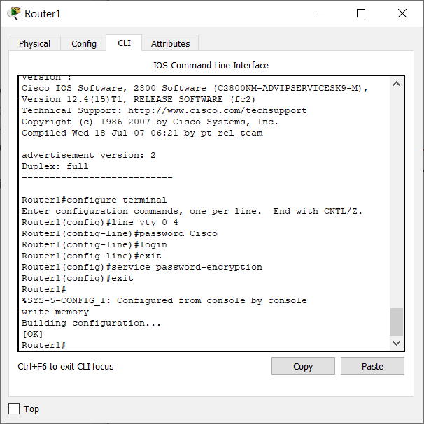 На роутере 1 настроена возможность работы по протоколу telnet, что продемонстрировано на рисунках 5.