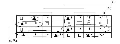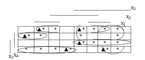 тест. Наконец, интервал х1х3х5, расширяясь по переменной х5, заставляет ввести в тест набор 01101. Расширения остальных интервалов уже проверяются введенными в тест наборами. Окончательно, нужно расставить значки (