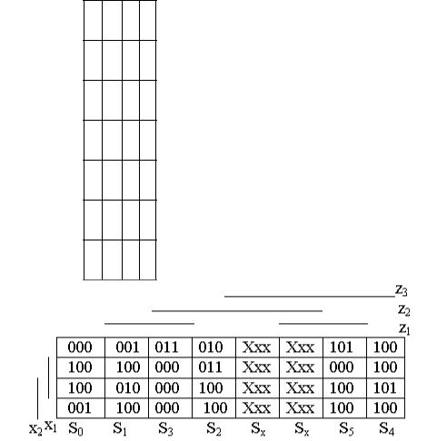 Прежде всего обратим внимание на расстановку состояний по столбцам кодированной таблицы переходов и выходов. Они расставлены согласно их кодированию. Состояния Sx обозначают не использованные коды 110 и 111.