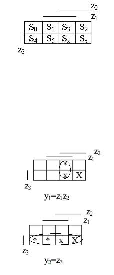 Функция у1 принимает единичное значение на единственном наборе, соответствующему состоянию S3 – это набор 011. И кроме того она не определена на наборах, соответствующих состояниям Sx. Функция у2 Принимает единичное значение на наборах, соответствующих состояниям S4, S5 и не определена на наборах для состояний Sx.