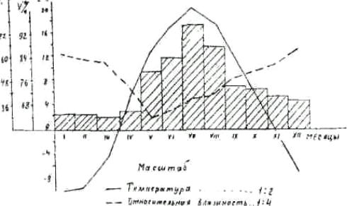 Значения относительной влажности также откладываются в середине месячного отрезка. Точки соединяются пунктиром зеленым цветом.